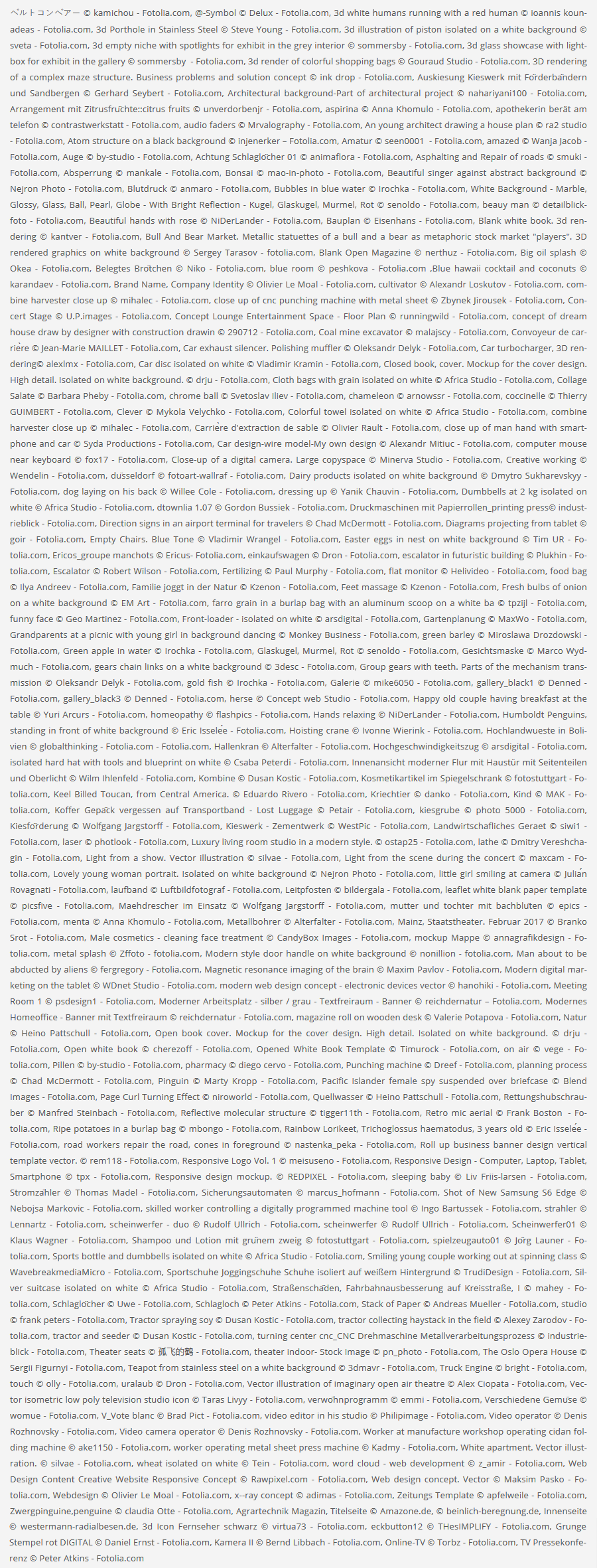 Als Anbieter für alle Medien crossover müssen wir auch aus Kostengründen passende Bilder von anderen Fotografen zukaufen. Da wir diese auch als Portfolio auf unserer Homepage zeigen, müssen wir in der Liste jedes einzelne Bild - aber eben auch Bild im Bild dokumentieren. Daher ist die folgende Liste sehr ausführlich und lang.